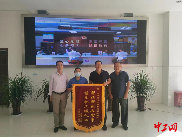 困难职工宋伟向县总工会送锦旗表达感谢。何云萍 摄