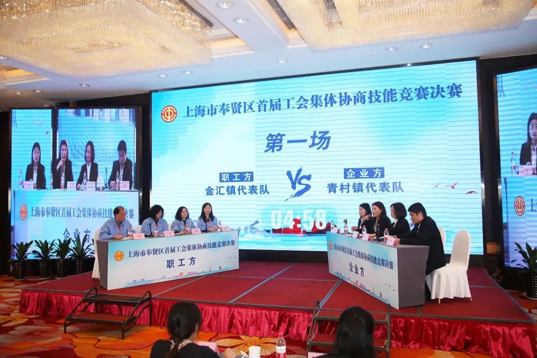 据奉贤区总工会微信公众号消息,10月14日下午,上海市奉贤区首届工会集体协商技能竞赛决赛“和谐协商 携手筑梦”在南桥镇举办。经过前期的初赛,来自奉贤区基层工会组成的四支队伍抽签选取企业方或职工方,围绕协商案例,两两对战,现场还原了两场精彩的集体协商过程。