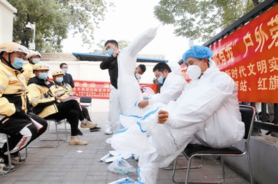 近日,红桥区咸阳北路街道在红旗社区红色先锋驿站开展“奋进新征程 劳动创幸福——技能强国有你有我”工会入会主题宣传和技能竞赛活动。现场,15名外卖小哥在通过系统培训后进行穿脱防护服演示,在比拼中巩固所学知识。工作人员还为外卖小哥们介绍了新就业形态劳动者加入工会组织的相关政策,送上了手套、护膝等慰问品,并号召广大户外劳动者做文明城市创建的践行者、宣传者、监督者。