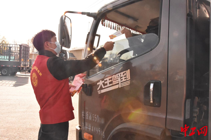 活动中,林西县总工会工作人员围绕建会入会的重要意义、加入工会的好处等内容与货车司机展开交流,并向他们分发林西县总工会制作的《工会知识小百科——建会早知道》宣传折页。