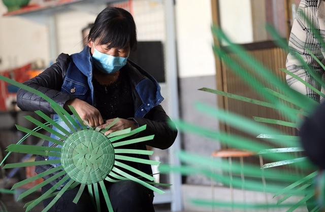 11月17日,在行唐县安香乡米霍口村,当地村民在编织花篮。