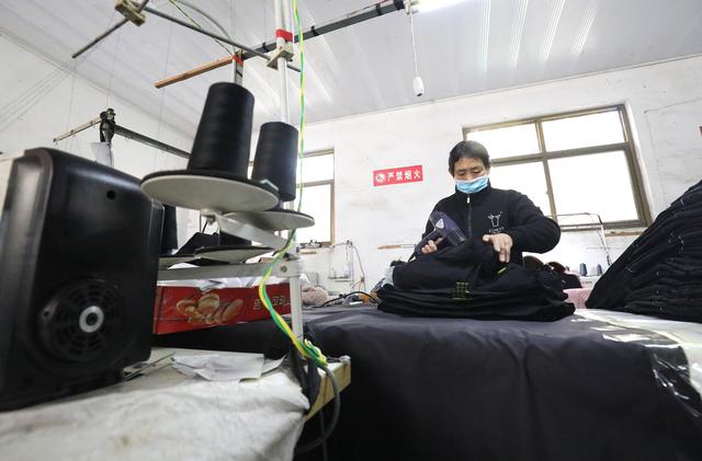11月17日,在行唐县上方乡东井底村一家手工车间,当地村民在赶制服装订单。