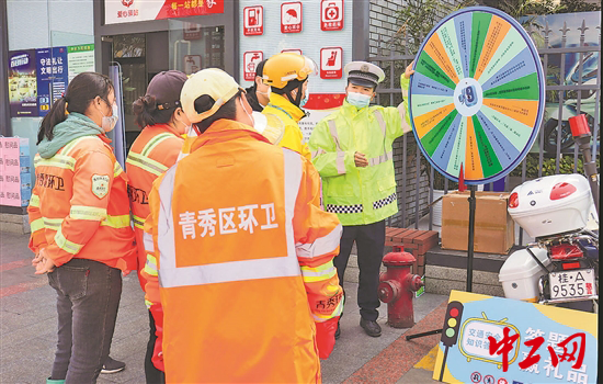 12月21日,广西壮族自治区南宁市的环卫工等户外职工在“一岗一驿站”参加开放日活动。今年6月,自治区总工会、南宁市总工会、市交警支队等单位开始探索户外劳动者服务站联建共享新模式,并设立“党员先锋岗·工会爱心驿站”,服务交通干警和新就业形态劳动者等。
