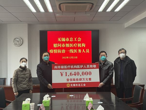 12月23日,无锡市总工会主席陈德荣走访市卫生健康委,看望慰问机关干部职工,并送上164万元慰问金用于慰问市级医疗机构疫情防治一线医护工作者。江阴市总工会慰问奋战在一线的医护人员并送上近10万元慰问金,宜兴市总工会筹集36万元慰问物资,梁溪区总工会发放30万元慰问金,锡山区总工会送上60万元慰问金,惠山区总工会筹措66万元慰问金,新吴区总工会筹集慰问金30万及慰问品15万,滨湖区总工会为一线医务人员送上2200余份水果、牛奶等物资,价值33万余元……据统计,截至目前,全市各级工会筹措慰问金和发放慰问物资已达400余万元,把党和政府的关怀、工会组织的温暖,及时精准送到广大医护人员的心坎上。