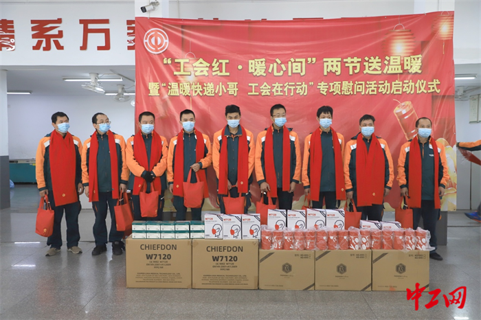 中工网讯  12月28日上午,厦门市总工会在邮政湖滨南投揽部开展“工会红 暖心间”2023年两节送温暖活动暨“温暖快递小哥工会在行动”专项慰问活动启动仪式。厦门市总工会党组成员、二级巡视员陈幼萍,现场为邮政快递员代表送上“工会红”围巾和防疫礼包。