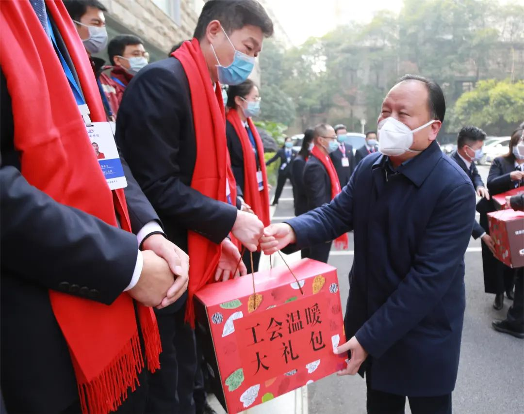 图为周农为省疾控中心职工送上工会温暖大礼包