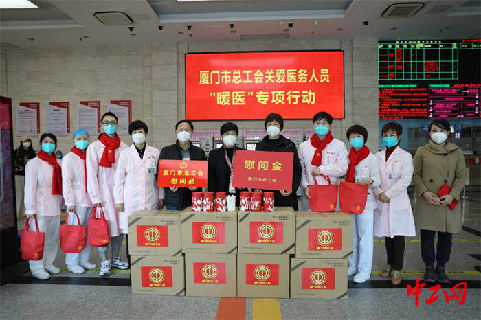 中工网讯 1月6日下午,厦门市总工会开展关爱医务人员“暖医”专项行动,慰问组为厦门市妇幼保健院的一线医务人员送上慰问金和200个装有保温杯的工会“小红袋”。