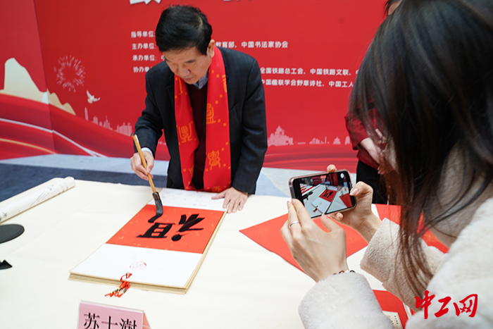 第十二届全国政协常委、中国书协名誉主席苏士澍为职工书写“福”字、对联。中工网记者王鑫 摄