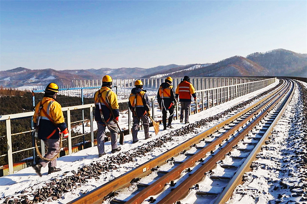梅集铁路线地处长白山腹地,是东北地区重要的客货运输通道。这条铁路线穿过了长白山脉的崇山峻岭,横跨纷繁交错的河道,冬季平均气温达到了零下30多摄氏度。为防止桥涵隧道积冰影响列车运行安全,通化工务段的铁路工人们要在恶劣的环境中清除积冰,保证桥体和铁路线路的安全。