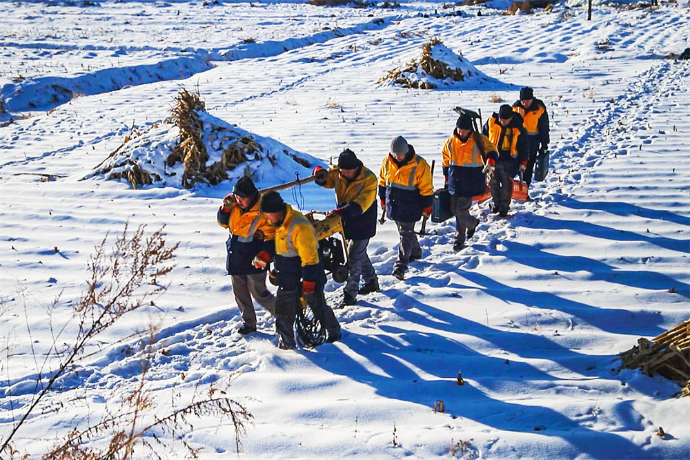三九严寒,山里出奇地冷,冰块也冻得格外硬实,镐头抡上去只能砸出来一个小坑,飞溅的冰碴崩打在职工的护目镜上啪啪作响……刘传双和工友们首先要清理桥体涵洞周围的积冰,由于作业位置都在山沟沟里,重型机械上不来,除冰只能靠人工作业。在处理体积较大的积冰时,工人们要电锯电镐齐上阵,碎冰在空中卷起阵阵“冰雾”,钻到人们的衣领、袖口里。