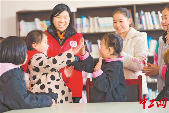 1月8日,党员志愿者在贵州省黔西市雨朵镇易地扶贫搬迁点农家书屋的活动室里和孩子们一起做拍拍手游戏。