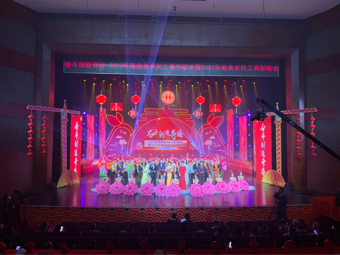 中工网讯 据海南省总工会微信公众号消息,1月9日晚,由海南省总工会主办、海南广播电视总台(集团)承办、海南新闻频道执行的“奋斗创造奇迹” 2023年海南省农民工春节联欢暨2022年最美农民工表彰晚会在海南省歌舞剧院举行,晚会现场宣布2023年“暖心留工助发展”工会关爱送温暖行动正式启动。省人大常委会副主任、省总工会主席陆志远,省总工会党组书记、常务副主席王全,省总工会党组副书记、副主席赖泳文出席活动并为“最美农民工”颁奖。