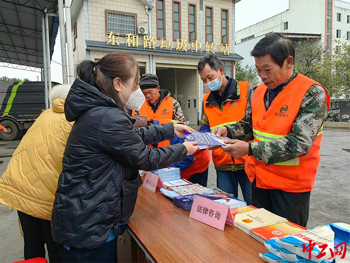 新区总工会工作人员向职工群众发放进度宣传资料。柯宇 摄