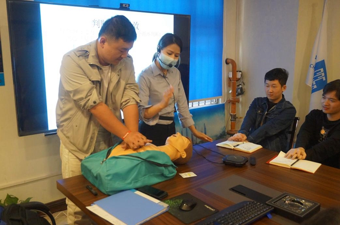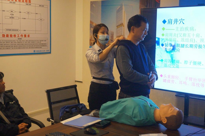 此次培训共包括施工现场安全急救与慢性职业病防治两方面,老师首先讲了施工现场可能发生的意外情况与急救方式,详细阐述了心肺复苏的要点与方法、各部位创伤创口的处理与包扎,并邀请在场员工亲自上台操作,老师在旁指出操作中的问题,帮助学员进行强化记忆,在实战中找问题,学方法;第二部分针对脊椎病、尘肺病、肩周炎等常见的慢性病、职业病进行讲解,传授个人自检方式和中医针灸预防窍门。