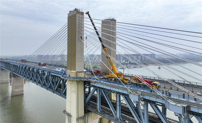 “各项监测数据正常,C8索张拉结束。”4月14日上午,芜湖长江大桥斜拉索更换施工现场负责人刘曙光对讲机里的指令传来。当天,由中国铁路上海局集团有限公司工务部组织、芜湖工务段和中铁大桥院旗下中铁桥隧技术有限公司实施的芜湖长江大桥斜拉索更换主体工作顺利完成。