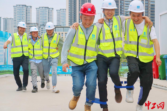 中建二局四川分公司天府总部基地一批次市政配套工程项目职工正在进行“三人四足”游戏。