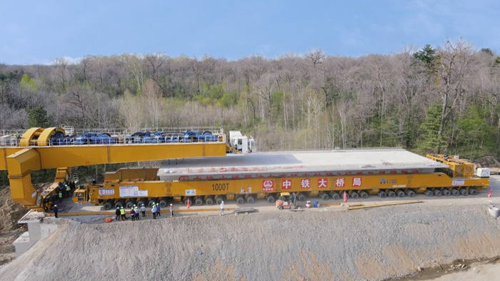 该箱梁长40.6米,跨度为39.3米,梁体中心线处高度为3.235米,架设在松江河1号特大桥17号墩与白河台之间。标段内共需采用箱梁232孔,满足13座桥供梁需求。箱梁在松江河梁场预制后,由1台1000t轮胎式运梁车通过马道、路基运输至桥台,供梁里程约30.211千米。
