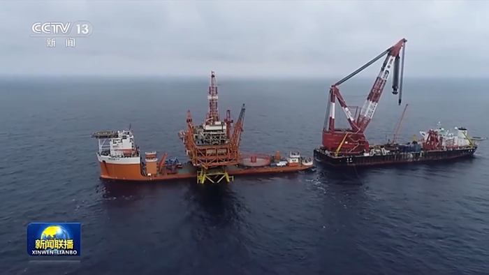 经过近6个小时的作业,下午六点,恩平20-4海上钻采平台与之前已经安装在海底、高达百米的导管架,成功实现了精准对接。
