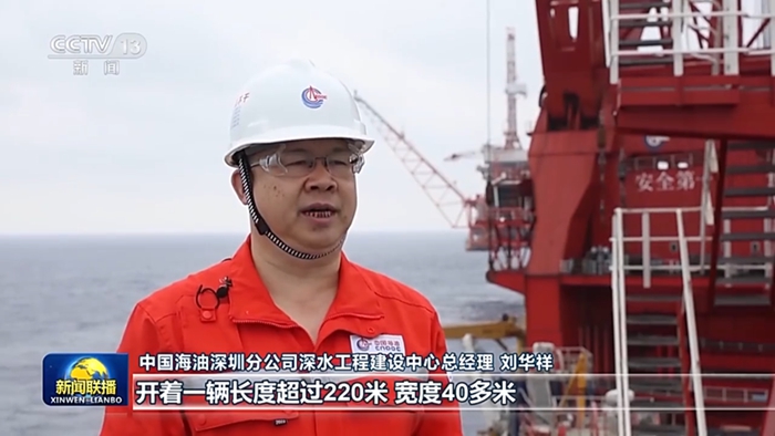 中国海油深圳分公司深水工程建设中心总经理 刘华祥:作业过程相当于开着一个长度超过220米、宽度40多米,装载10000辆小汽车的超级卡车,在风浪流不断变化影响的海面上进行倒车入库,且两侧边缘误差不能超过10厘米,对设计计算精确性、动力定位系统的可靠性、操作人员的技术水平均提出极大挑战。