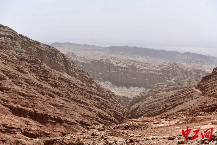 考核车辆正在悬崖旁的细窄道路上前行,车后扬起滚滚尘土。张野 摄