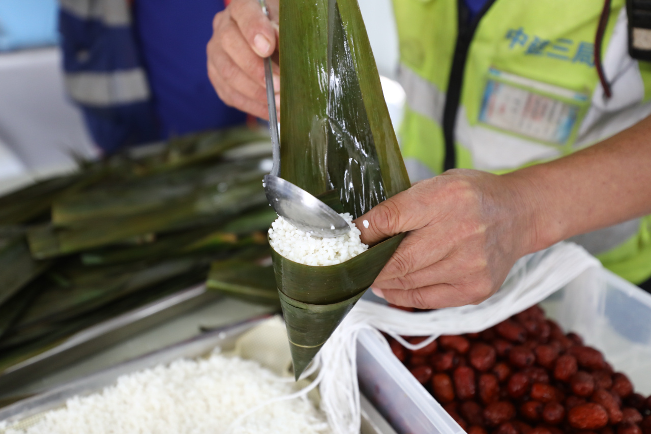 活动现场,项目部备好了粽叶、糯米、红枣、粽子线等必需物品后,大家一起围在摆放整齐的材料前在“老师傅”的指导下,大家认真学习包粽子。卷粽叶、放糯米、压实、捆扎……忙得不亦乐乎。