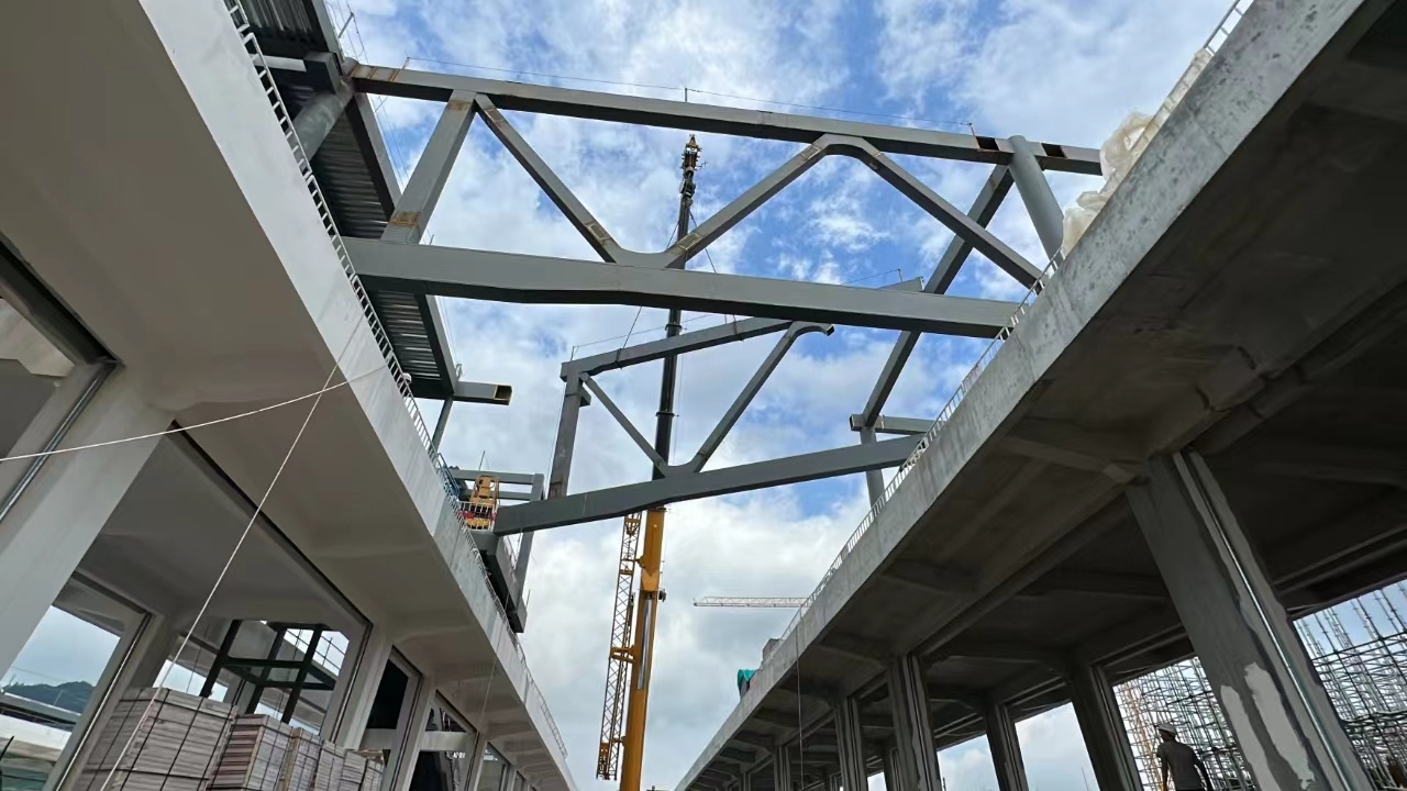 天桥钢结构采用空间桁架结构体系,桁架单元的上、下弦杆及腹杆均采用箱型钢梁,总重480t,最大跨度27.5m,单片吊装最大重量约29吨。天桥吊装施工直接制约站场无砟轨道施工和正线贯通,是站场段施工的关键工序。本次钢结构天桥吊装施工完成,标志着九华山站场施工即将进入全新阶段,为全线贯通奠定了基础。