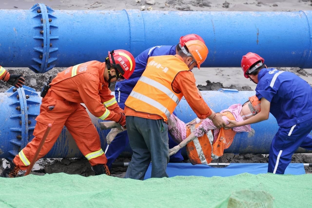 “消防人员现场开展救援,医疗救护组派医疗人员对基坑伤员进行前期救治!”