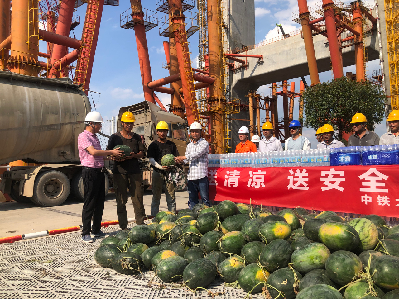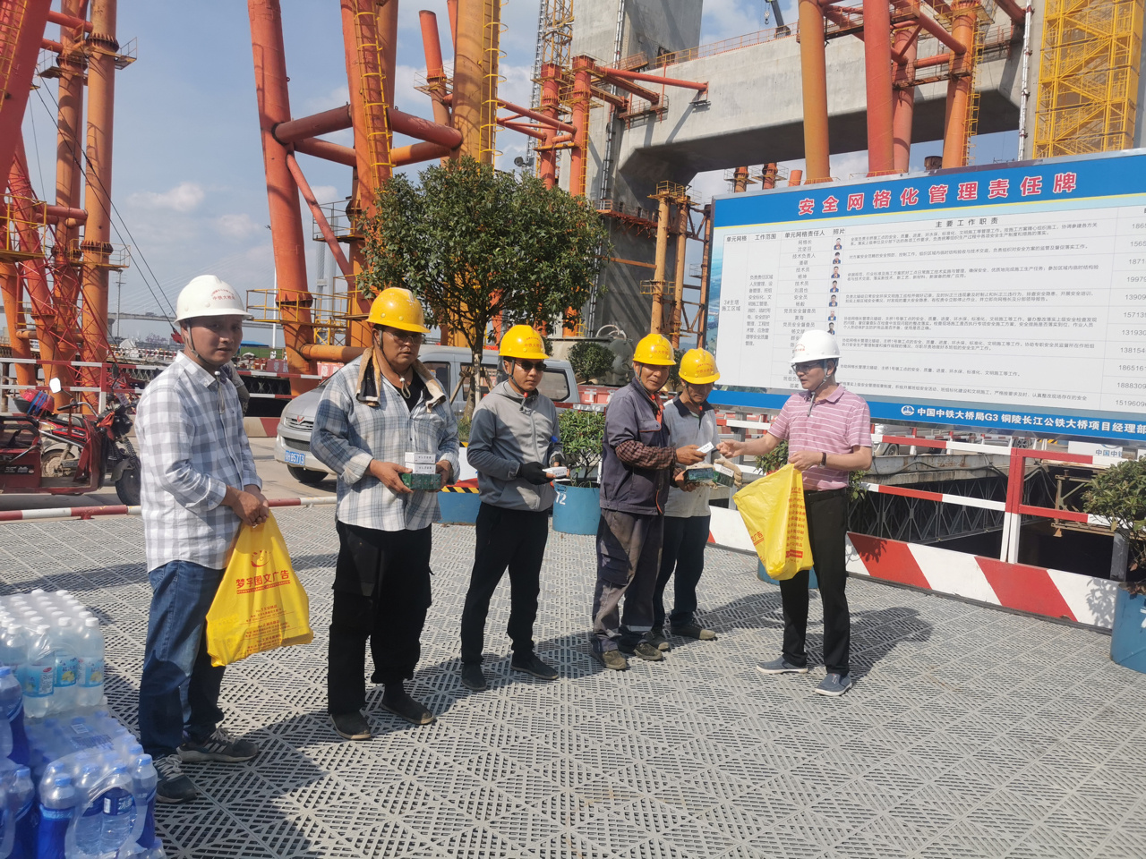 7月11日,入伏第一天,中铁大桥局G3铜陵长江公铁大桥项目一分部开展了送清凉、送安全、送健康“三送”慰问活动,向高温天气下坚守岗位的农民工送去清凉慰问品。