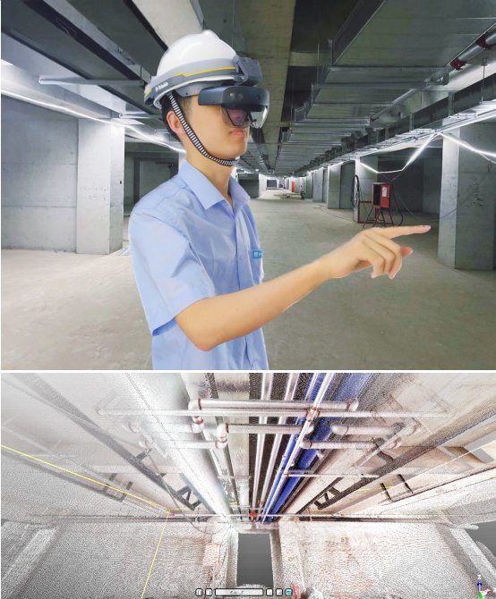 项目涉及的机电消防管线、桥架、电气管线等,标高均不相同,为克服人工安装极易导致的交叉碰撞问题,项目团队应用MR混合现实眼镜,将机电BIM模型按照1:1虚拟布置在机电管线安装过程中,指导现场施工,对现场机电安装复位校核,做到现场与模型图纸一致,精准把控机电管线定位。 |