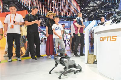 9月3日,人们在国家会议中心观看一款仿生四足机器人。新华社记者 鞠焕宗摄