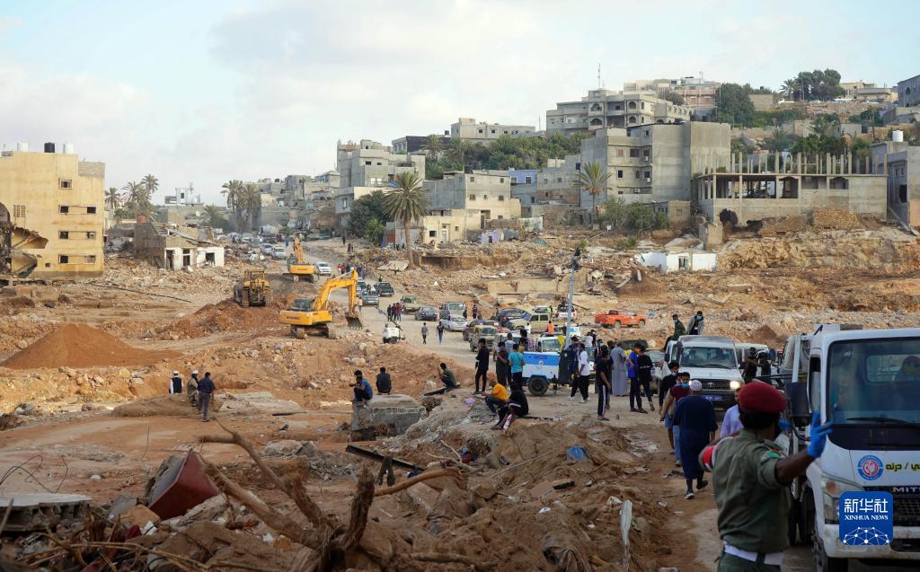 9月16日,救援人员在利比亚德尔纳的受灾地区工作。