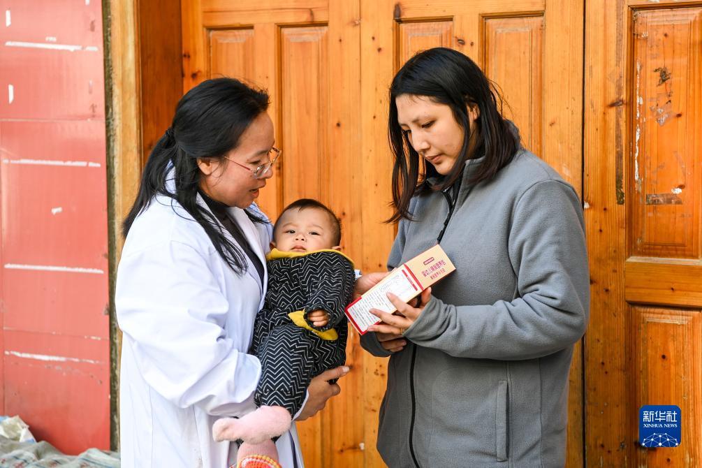 12月6日,在广西钟山县花山瑶族乡林坪村,唐丽红(左)给一名妇女讲解婴儿辅食营养包的使用方法。