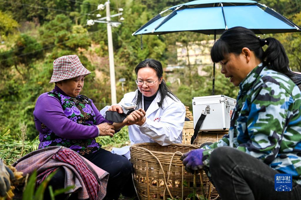 12月6日,在广西钟山县花山瑶族乡林坪村,唐丽红(中)在田间地头给村民测量血压。