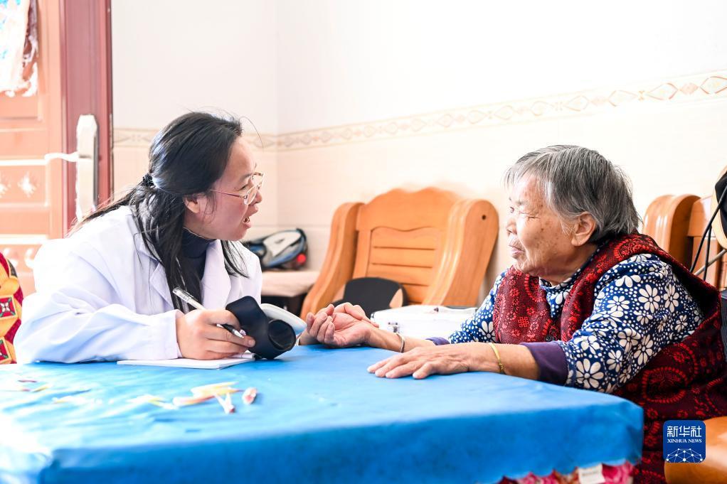 12月6日,在广西钟山县花山瑶族乡林坪村,唐丽红(左)上门为老人做健康检查。