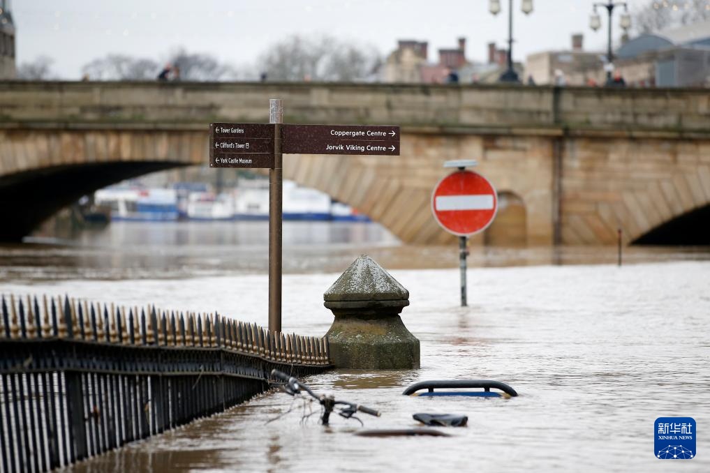 1月5日,在英国英格兰北部约克,路标浸泡在洪水中。 新华社发(克雷格·布劳摄)