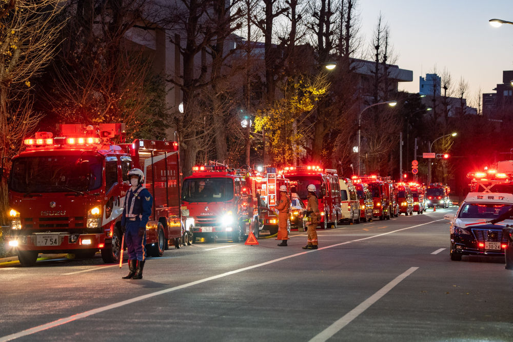1月8日,消防员和警察在日本前首相田中角荣位于东京的旧宅前执行公务。