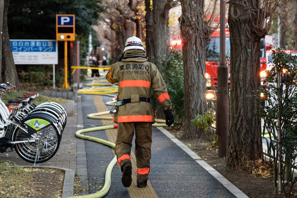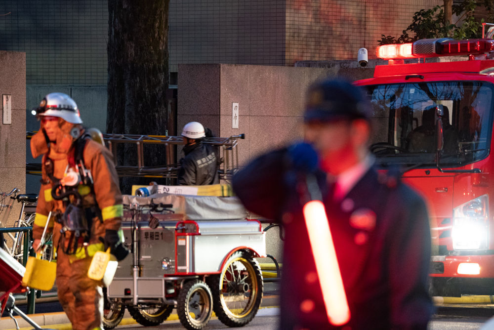 1月8日,消防员在日本前首相田中角荣位于东京的旧宅前执行公务。