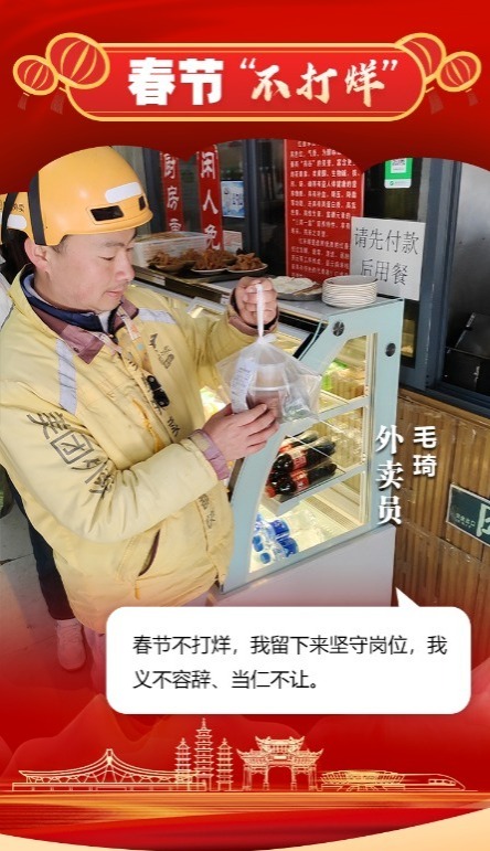 “春节不打烊,我留下来坚守岗位,我义不容辞、当仁不让,作为一名基层劳动者,全心全意服务好我们这个城市,让我们的城市更加美好。在此期间,祝愿大家身体健康、阖家安康、幸福美满!”毛琦说。