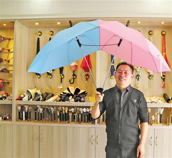 雷鹏琳展示双人伞。共享联盟·上虞 张汉锋 摄