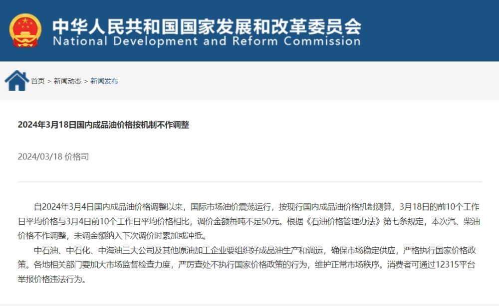 自2024年3月4日国内成品油价格调整以来,国际市场油价震荡运行,按现行国内成品油价格机制测算,3月18日的前10个工作日平均价格与3月4日前10个工作日平均价格相比,调价金额每吨不足50元。根据《石油价格管理办法》第七条规定,本次汽、柴油价格不作调整,未调金额纳入下次调价时累加或冲抵。