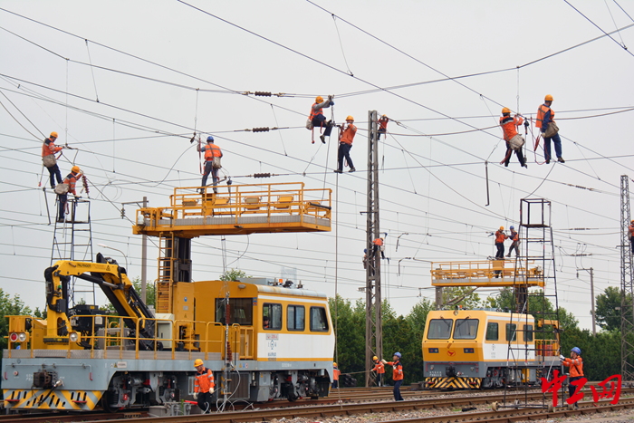 当日,南京维管段加大对管段内接触网供电设备的检修力度,组织86名铁路接触网工齐聚南京东站进行软横跨更换作业,全力冲刺抢工期、赶进度,严格落实标准化作业程序,消除供电设备安全隐患,为繁忙暑运列车安全运行保驾护航。(文/图:杜希昊)
