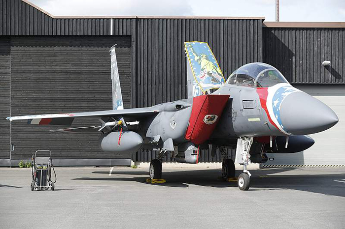 | 资料图:2023年5月31日,芬兰坦佩雷,一架美国空军F-15战斗机亮相北极挑战-2023演习。 |