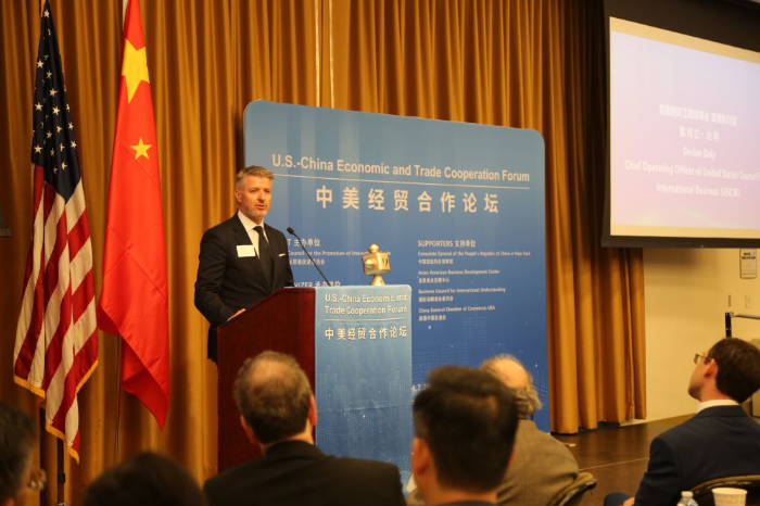 | 7月29日,在美国纽约,美国国际工商理事会首席运营官戴克兰·达利在中国—美国经贸合作论坛上致辞。中国—美国经贸合作论坛29日在纽约市举行,300余位中美企业及商协会代表出席。新华社记者刘亚南摄 |