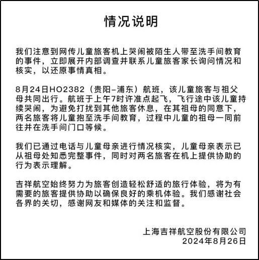 | 8月26日,吉祥航空发布了一份情况说明。 |