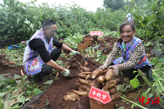农户拔起雪莲果,一棵上挂着七八个果实,分量十足。杨宛 摄