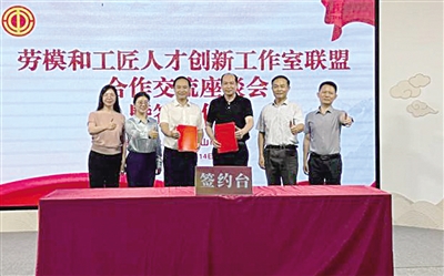 为推动对口帮扶、增进区域交流合作,中山、潮州两地工会经过前期充分的调研交流及友好协商,决定开展两地劳模和工匠人才创新工作室、职工创新工作室深度合作。当天,在中山、潮州两地总工会领导、劳模和工匠人才创新工作室领衔人、行业代表的共同见证下,两地总工会正式签署联盟合作协议。