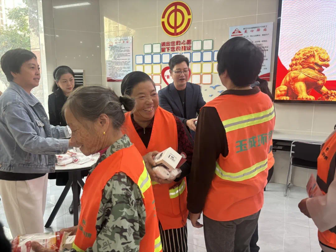 同日下午,市总工会职工维权服务中心主任田军在东风路街道开元社区三和人力市场工会驿站开展宣讲活动。宣讲结束后,市总工会还为参加活动的保洁员、城管队员送上护手霜、保温杯等慰问品。