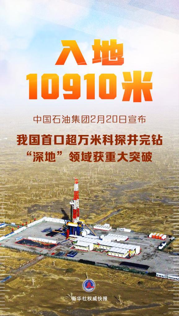 新华社北京2月20日电(记者戴小河、顾煜)中国石油集团2月20日宣布,我国首口超万米科探井——深地塔科1井日前在地下10910米胜利完钻,成为亚洲第一、世界第二垂直深度井。这是我国在“深地”领域取得的重大突破。 这口超万米深井还创下全球尾管固井“最深”、全球电缆成像测井“最深”、全球陆上钻井突破万米“最快”、亚洲直井钻探“最深”、亚洲陆上取芯“最深”共五项工程纪录。 在地处新疆塔克拉玛干沙漠腹地的钻探现场,中国石油塔里木油田前方指挥部电子屏幕上的数字停在了10910.00。约20层楼高的井架矗立于茫茫沙海中,寒风呼啸、沙尘肆虐,石油工人就是在这样的环境下打出了中国速度和深度。 深地塔科1井于2023年5月30日开钻,成功钻取我国首份地下万米岩芯标本,在陆地万米深层全球首次发现油气显示。 深地塔科1井井长王春生说,深地塔科1井从进入地表到钻抵万米,用时270多天;从万米到最后的900多米,耗时300多天。耗时陡增背后,是难度的攀升,特别是进入万米后,钻杆柔软得像面条,地层硬度“爆表”,还面临超重载荷、井壁失稳、地层井漏等困难。 直面世界级地质和工程技术难题,中国石油组建万米深井攻坚团队集智攻关,研发全球首台12000米特深井自动化钻机、全球首套万米特深层测井装备等,推进我国深地产业链的自主性和安全性得到极大提升。在这批装备的支撑下,中国石油连续钻穿12套地层,最终与5亿多年前的岩层相遇。 科研人员根据万米深地取回的岩芯、岩屑等样品和数据,绘制出亚洲第一份万米地质剖面图,为深地科学探索和油气勘探提供翔实资料,将有力支撑地球深部结构与物质组成、地球演化、气候变迁等基础科学问题研究。