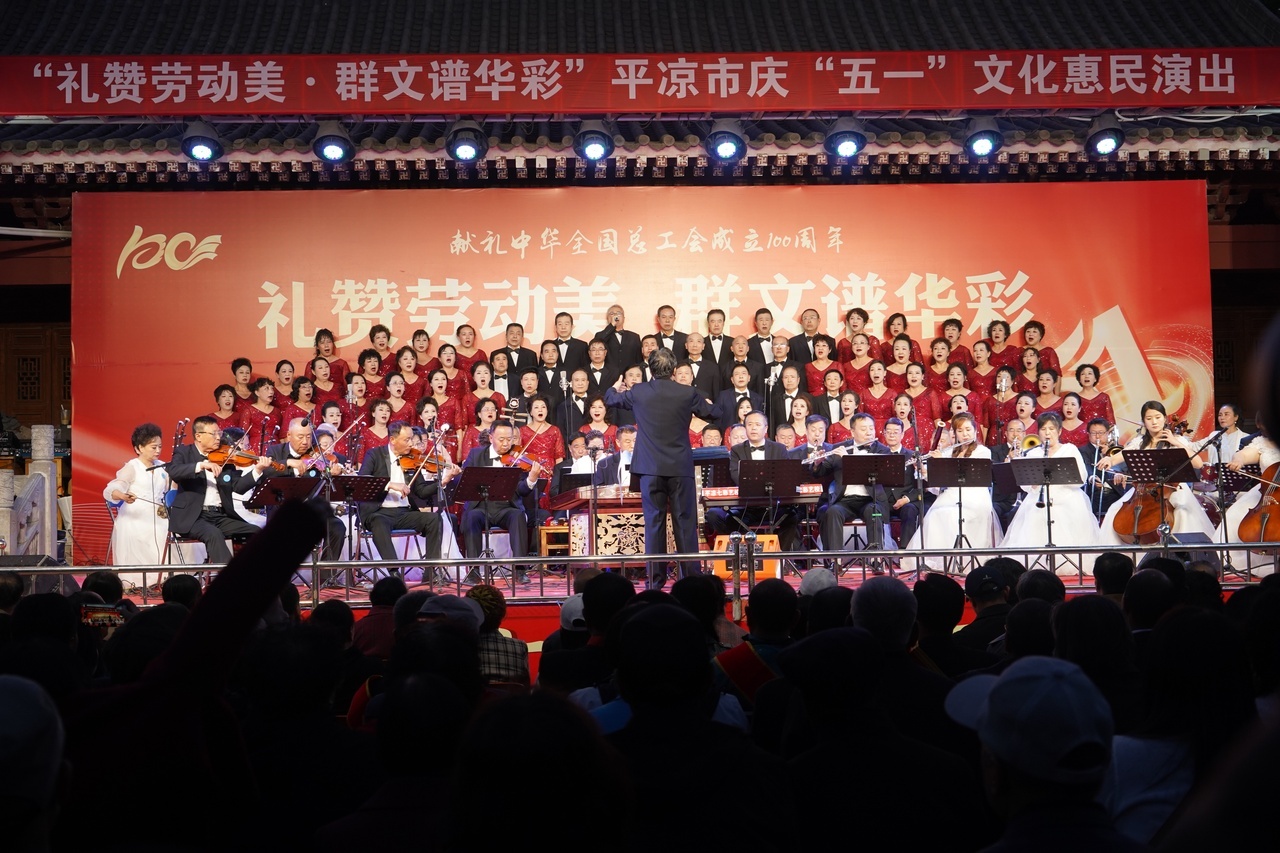 4月29日晚,甘肃省平凉市柳湖书院内灯光璀璨,“礼赞劳动美——群文谱华彩”平凉市庆祝“五一”国际劳动节音乐会,在开场大合唱《祖国颂》中拉开序幕。