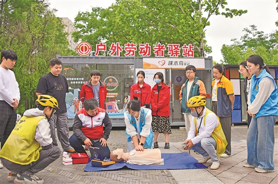 5月8日是世界红十字日。当日,红十字会志愿者来到浙江省台州市仙居县市民公园户外劳动者驿站,指导外卖骑手学习心肺复苏技能。今年以来,仙居县总工会为外卖骑手等新就业形态劳动者开展心肺复苏和海姆立克急救法等救护技能培训,旨在打造一支外卖骑手应急救护队,为市民健康安全提供应急保障。